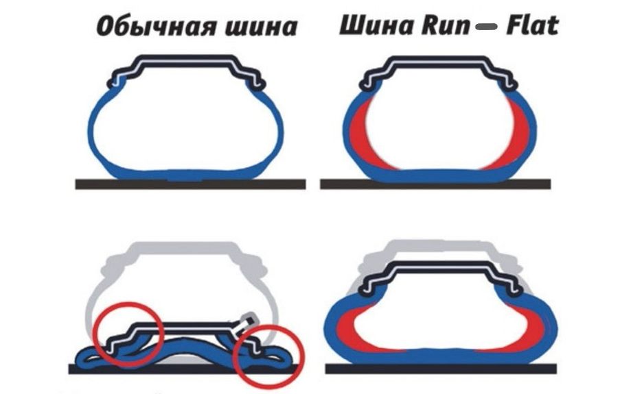 Run-Flat - это запатентованная технология, в основе которой лежит максимальное усиление шинной боковины. Когда обычная покрышка сдувается, то резина до обода прогибается под весом автомобиля. Естественно, ехать дальше нельзя: нужно доставать запаску с домкратом или вызывать эвакуатор. Run-Flat устроен иначе, его усиленные боковины не дают покрышке соскочить с диска и уверенно держат вес даже двухтонной машины. Проехать на «спущенных», правда, можно недолго – не более 100 километров, да и скорость придется убавить до 80 км/ч, зато вы точно сможете добраться до ближайшей сервисной мастерской для замены.