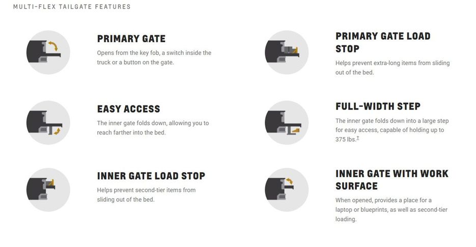 Шестифункциональный борт Multi-Flex Tailgate® предлагает набор функций для облегчения погрузки и разгрузки груза и доступа к грузовой платформе. Он оснащён встроенной дополнительной створкой и предлагает шесть уникальных «функций и положений», в том числе облегчённый доступ к грузам, лежащим сверху, режим лестницы для упрощённого входа и выхода с платформы. Борт может работать как сиденье, так и полноценное рабочее место (на нём можно пилить, строгать и т.д.). При этом он выдерживает нагрузку до 170 кг.