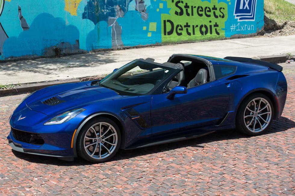 Интересно, что на заднем крыле синего Corvette заметны красные полосы — это характерная черта Grand Sport. Хотя другие детали автомобиля трудно различить, похоже, что он украшен уникальными красными эмблемами за задними воздухозаборниками и черными колесами. Наличие четырех выхлопных труб с центральным выходом указывает на мощный V-образный восьмицилиндровый двигатель.
