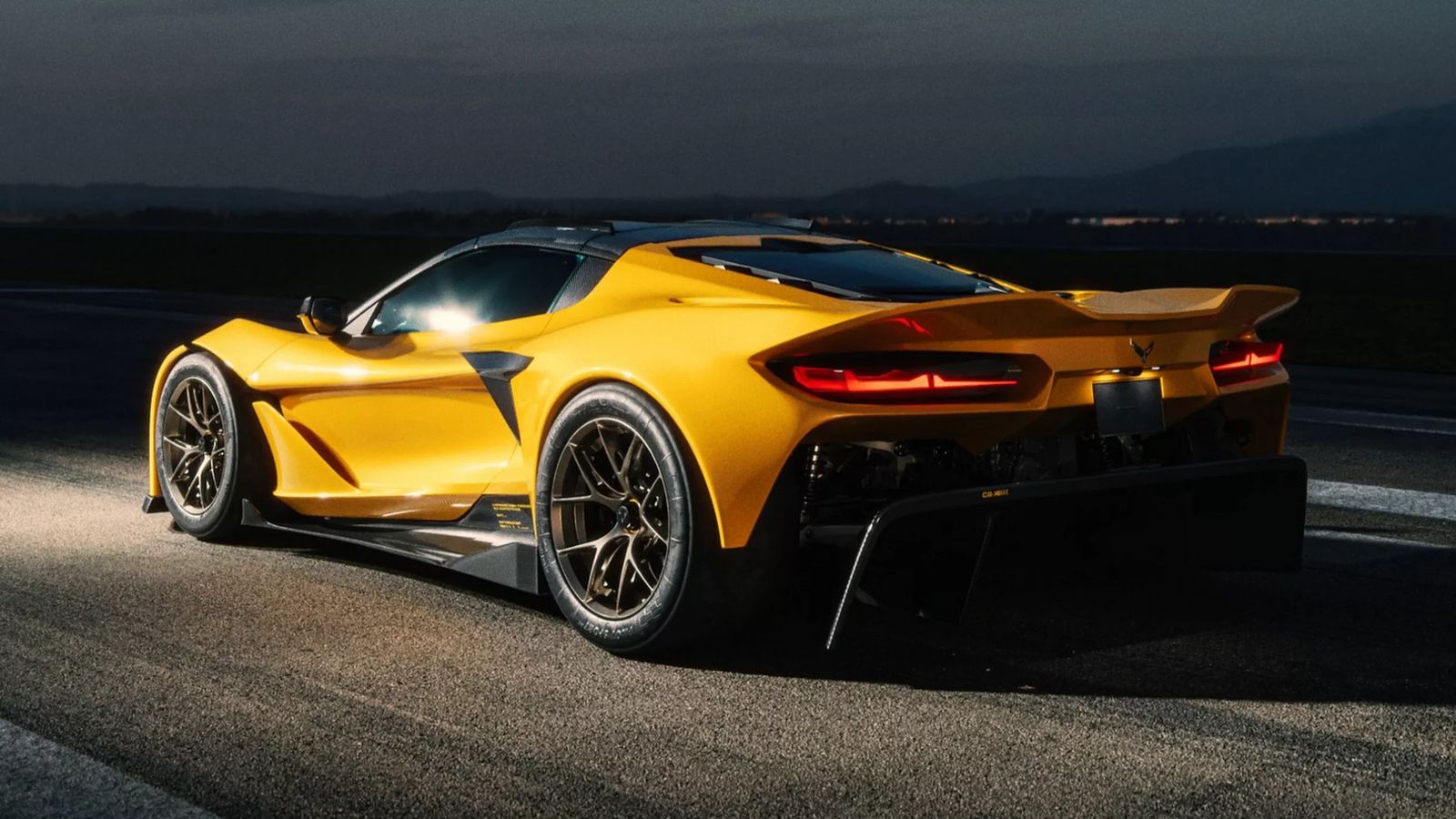 Задняя часть полностью переработана: тонкие горизонтальные задние фонари, интегрированный спойлер "утиный хвост", открытый дизайн бампера, подчеркивающий сликовые шины и массивный диффузор. Автомобиль окрашен в яркий желтый цвет с вставками из карбона и оснащен легкосплавными дисками с центральным креплением.