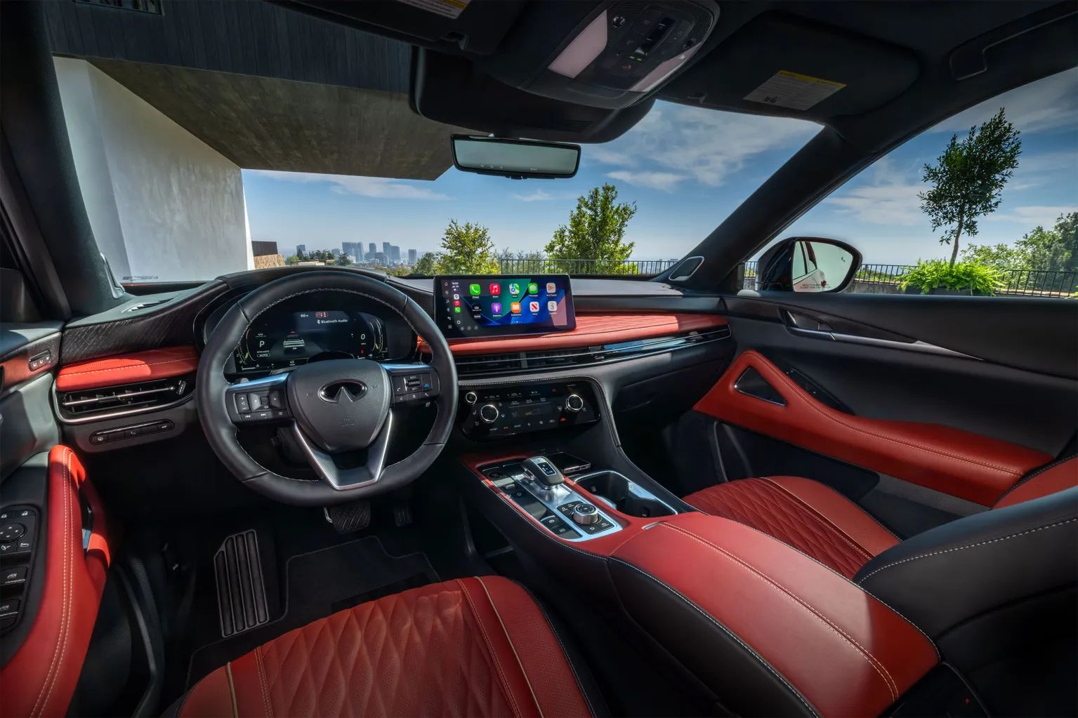Салон в версии Autograph выделяется красной кожаной отделкой с ромбовидной прострочкой, сочетающейся с серебристым декором и темным деревом.